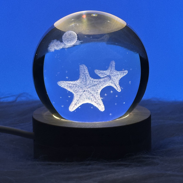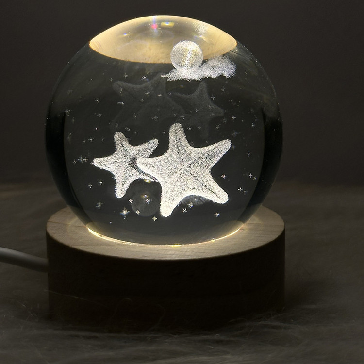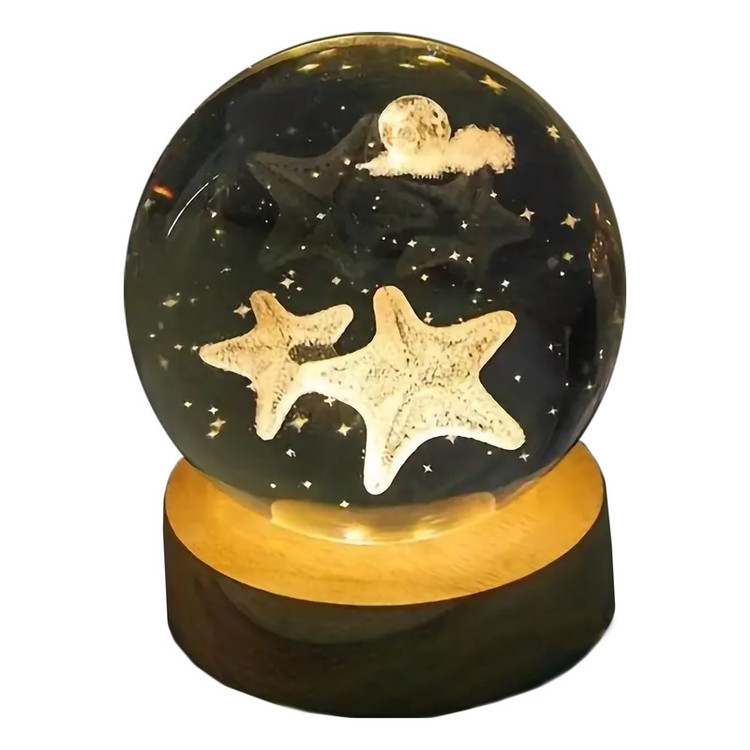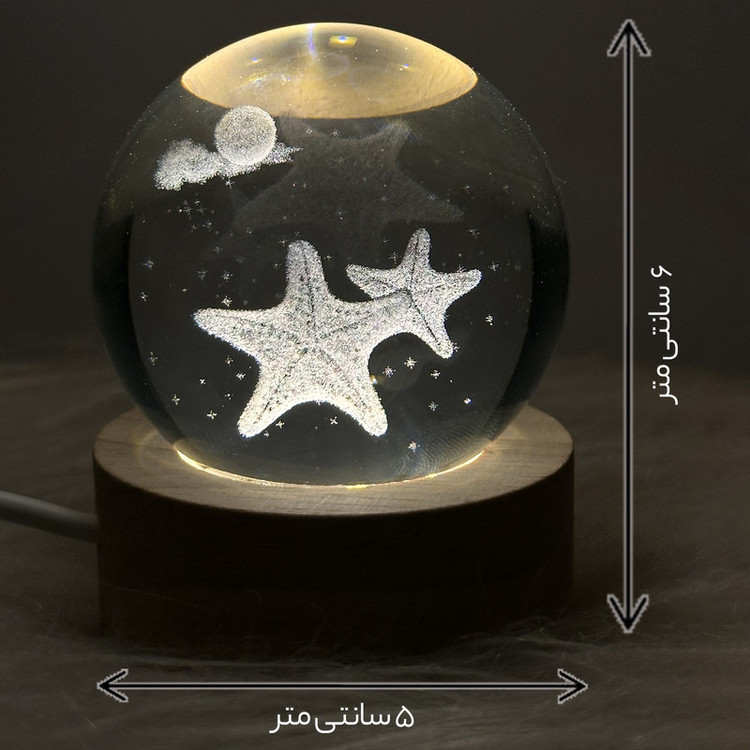 این چراغ خواب کریستالی به صورت سه بعدی و در طرح ستاره دریایی تولید شده که باعث جذابیت بیشتر اتاق خواب شما می شود. جنس این گوی شیشه ای از کریستال فشرده می باشد و همچنین دارای یک پایه چوبی و کابل برق USB می باشد که امکان اتصال به لپ تاپ، کامپیوتر، پاور بانک و شارژ گوشی را فراهم میسازد. این محصول دکوری منحصر به فرد و شیک و همچنین یک هدیه جذاب و ماندگار برای هر شخصی می تواند باشد.