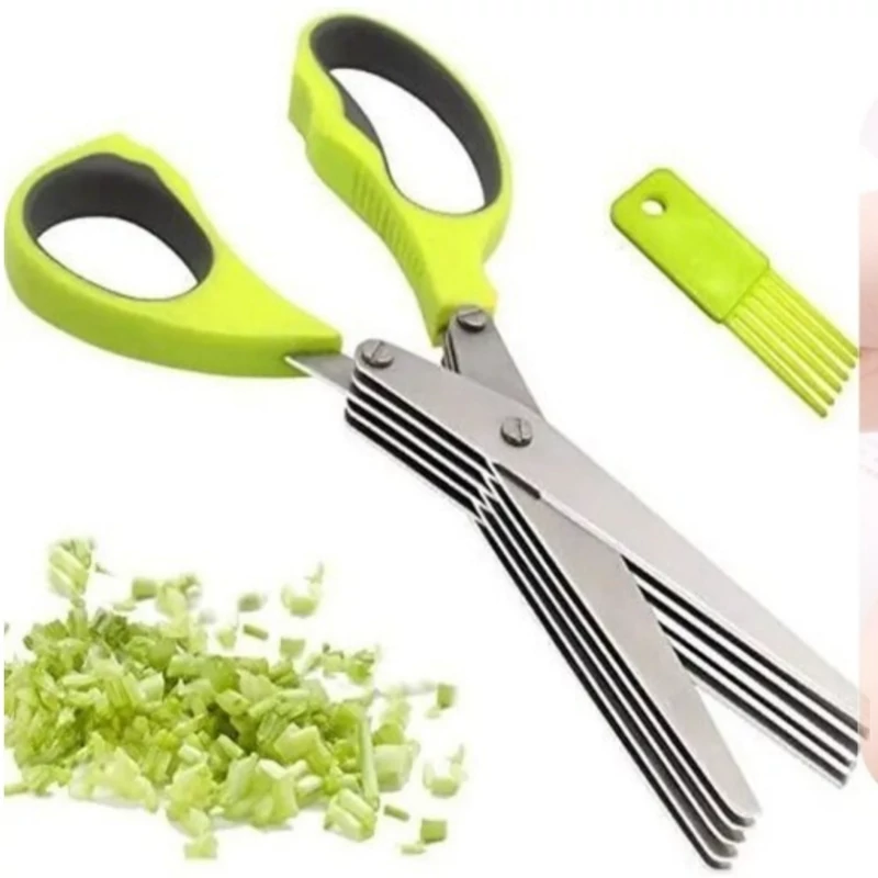 قیچی سبزی خرد کن ، یک قیچی 5 لایه، خرد کننده انواع سبزیجات در ابعاد یکسان است و علاوه بر تسریع فرآیند خرد کردن با ایجاد برش های یک اندازه تیغه های قیچی از استیل ضد زنگ ساخته شده اند، جنس دسته آن پلاستیکی است و مانع سر خوردن قیچی از دست می شود.