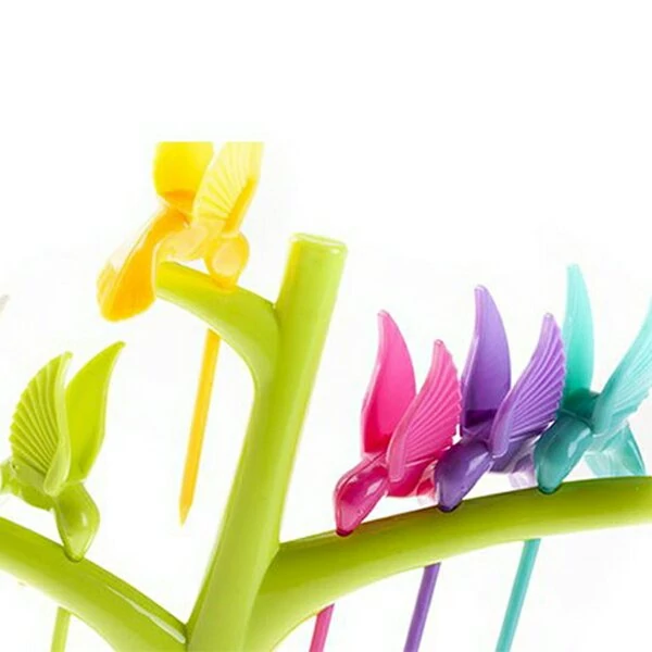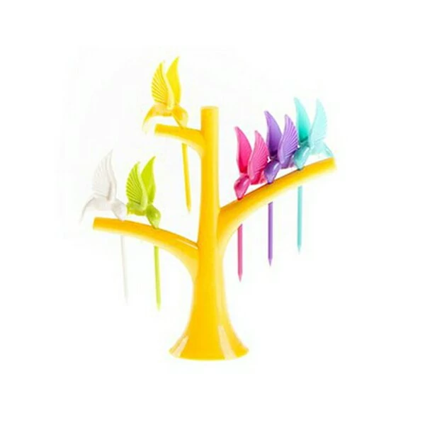 زیتون خوری درختی مناسب برای سرو زیتون و فینگرفودها و تیکه های میوه و کمپوت می باشد.این زیتون خوری درختی دارای یک درخت می باشد که روی آن پرنده های رنگی وجود دارد که شما می توانید به وسیله این پرنده های رنگی شاد زیتون و یا حتی میوه را بردارید و میل کنید.از این کبوترها به جای چنگال میوه خوری نیز می توان استفاده کرد بسیار زیبا و شیک می باشد.آرساکالا پیشنهاد میکند این ست چنگال های فانتزی مناسب برای استفاده بر روی میز های پذیرایی در منزل، رستوران، فست فورد و … طراحی گردیده است.